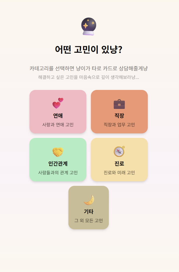 가벼운 고민을 털어놓을 곳이 마땅치 않은 사람들에게, 고양이가 냥체로 건네는 한마디가 작은 위로가 될 수 있겠다고 생각해서 기획했습니다. 심각한 고민도 귀여운 고양이와 함께하면 즐겁게 해결하고자 하는 마음에 여러종류의 고양이를 일러스트화 해서 타로 카드를 만들게 되었습니다.