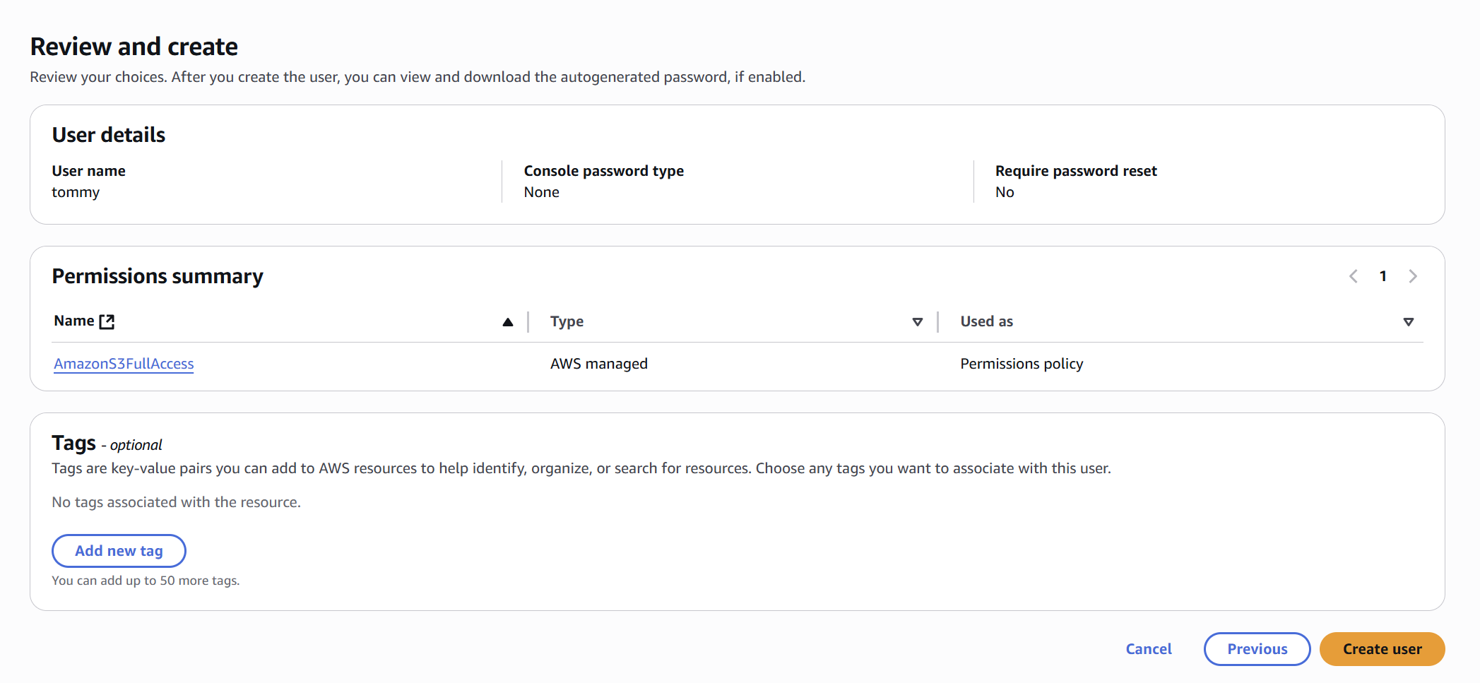 이 중에서 읽기/쓰기 모든 권한이 있는 AmazonS3FullAccess를 체크하고 next 를 누른다.