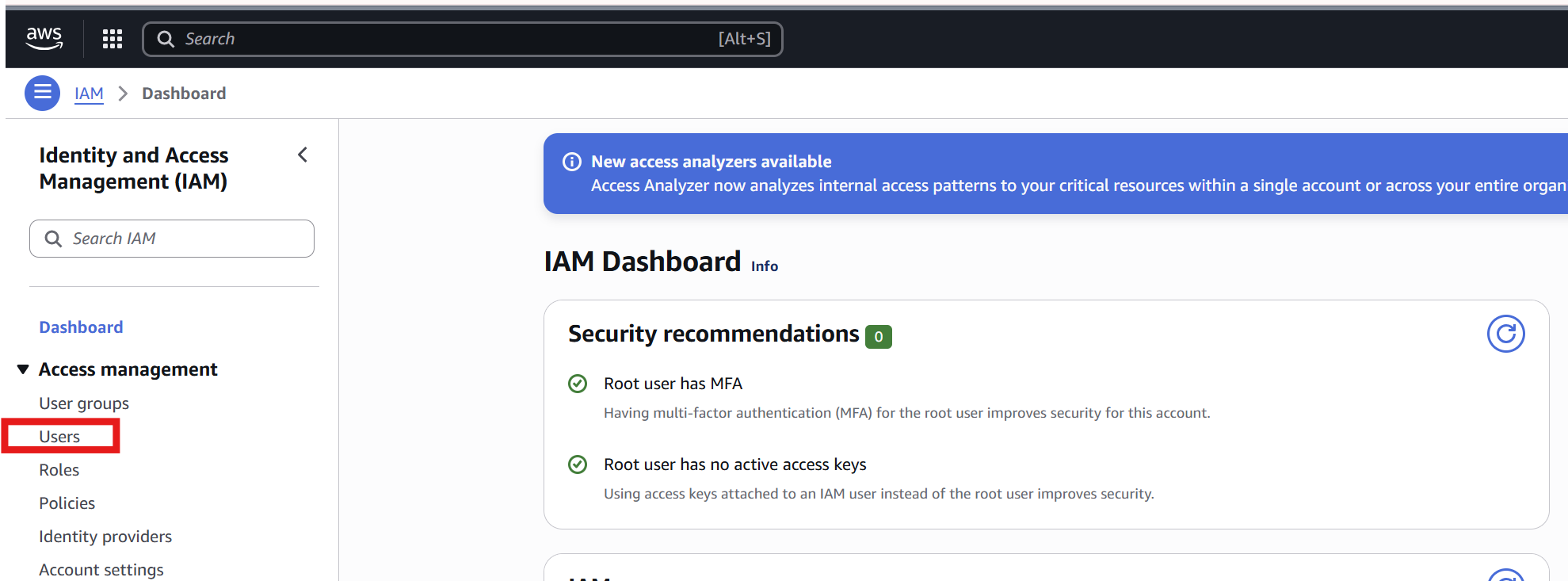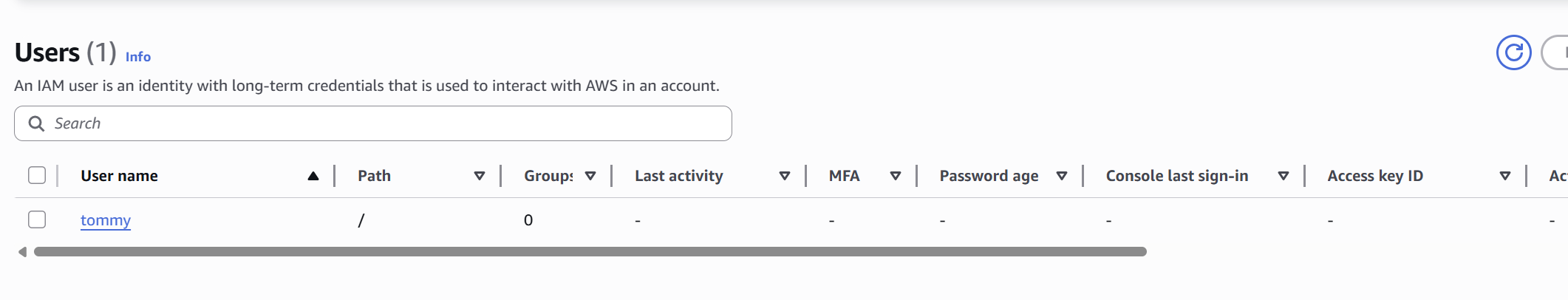 IAM( AWS 리소스에 접근할 수 있는 권한)으로 이동하여, users를 클릭.