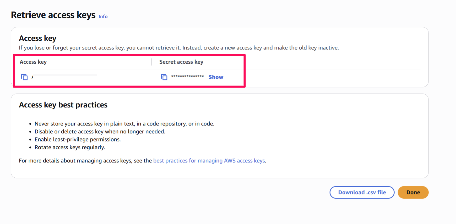 다음과 같이 Access Key 와 Secret Access Key가 생성되었다.